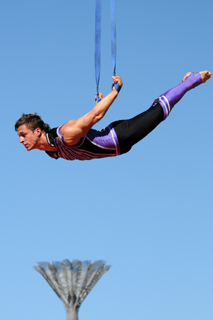 I n an impressive show of strength and precision a trim, muscled figure suspended in flight sweeps through the air. A routine using straps involves rolls, twists and holds performed in the air and on the ground.