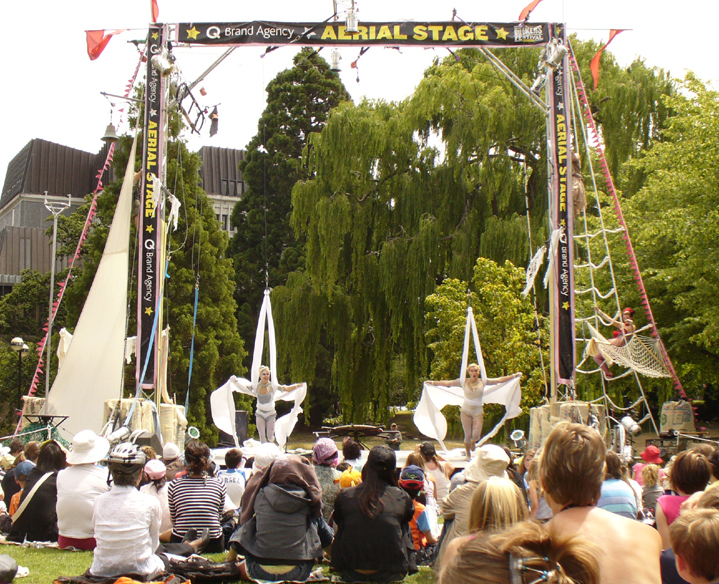 Tissu is rigged on a single point, so needs only a load bearing beam, RSJ, fly bar, crane, to a safety factor of 1:10. We can also supply our own free-standing truss system.